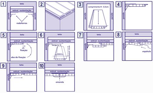 É muito importante que a estrutura de sustentação esteja bem nivelada. Estrutura de sustentação de madeira: fixação através de pregos ou grampos. Estrutura de sustentação em metalon: fixação através de rebites, parafusos ou grampos especiais. Marque em todos os cantos do ambiente, a partir do piso, a altura desejada para o forro. Una as marcas traçando linhas. Utilize essas linhas como base para a montagem da estrutura. Passo a passo: 1. Fixar os rodaforros em todos os lados da peça; 2. O rodaforro pode ser fixado na estrutura de sustenção ou com buchas diretamente na parede; 3. Recorte todos os perfis com o comprimento de 0,5 a 1 cm menor que o vão livre entre o fundo dos rodaforros; 4. Coloque o perfil, com a face aparente direcionada para baixo e o engate macho voltado para o fundo, dentro do vão dos rodaforros laterais; 5. Fixe o perfil em cada parte da estrutura, através da aba de fixação. Corte os demais perfis como o primeiro, encaixe o engate macho no fêmea do perfil anterior e fixe cada perfil na estrutura; 6. Para colocar o último perfil, corte no comprimento R 1,5 cm a menos que as demais. Meça o espaço entre a parte interna do encaixe fêmea da última lâmina colocada e o final do arremate. Da medida obtida desconte 8 mm para a dilatação do material. Marque essa nova medida nas duas extremidades da lâmina, trace a linha de corte, e efetue o corte; 7. Com o lado refilado direcionado para o rodaforro, encaixe as duas extremidades do perfil nos rodaforros laterais, mesmo que fique sobreposta ao perfil anterior; 8. Empurre o perfil contra o fundo do rodaforro, averiguando que seja feito em toda a extensão da tala. Facilite esse encaixe usando uma espátula; 9. Empurre o engate macho até uni-lo ao engate fêmea do perfil anterior; 10. Caso o comprimento do perfil não for suficiente para cobrir seu vão, utilize a "emenda" para unir os perfis. Pode ser necessário colocar um elemento extra na estrutura para fixá-la. Precauções: - Para a lavagem do forro, utilizar apenas água e sabão neutro. - Não instalar em ambientes com agentes químicos em suspensão. - Instalar longe de fontes geradoras de calor excessivo.