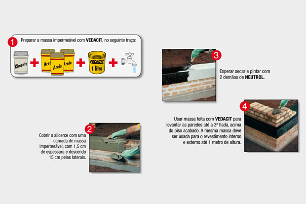 A forma mais simples, eficiente e econômica de ter uma casa seca e saúdavel é impermeabilizar a obra desde o alicerce, usando o VEDACIT na massa de assentamento e de revestimento. VEDACIT é garantia de impermeabilização definitiva, pois age dentro da massa e não é superficialmente como uma pintura. Por isso é que se diz: umidade tem limite: cimento, areia e VEDACIT.