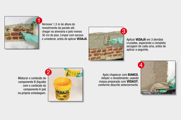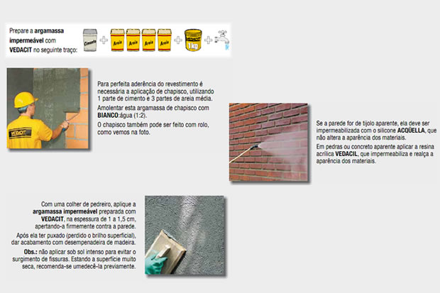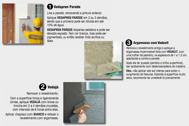 Se nas paredes externas não foi aplicada argamassa impermeável feita com VEDACIT, a água de chuva pode se infiltrar para o interior dos ambientes. Mas este problema pode ser corrigido, de uma das maneiras abaixo: